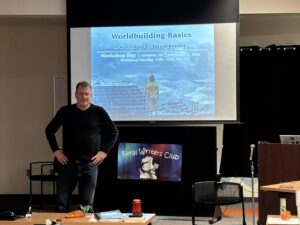The event featured four sessions. The first was basically about what it took to be a writer, i.e. – finding the time to write, the tools that writers might use, how to find useful educational events (such as this event), how to find a good writing group, etc. The second was on plotting and story structure. The third was my session on Worldbuilding. The final session was on crafting characters.