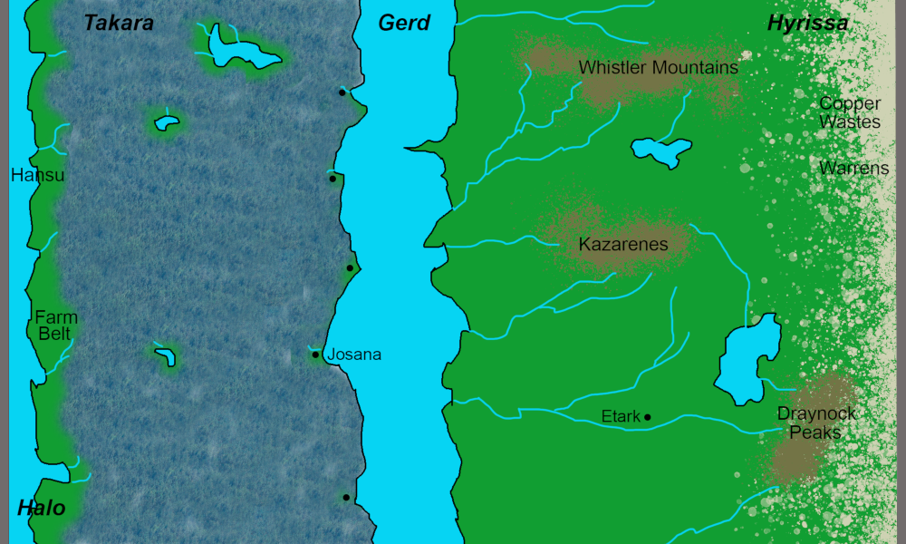 The northern land area is known as Hyrissa. It has no redwoods left and is almost entirely covered by farms, towns and cities. It is heavily overpopulated and controlled by an increasingly aggressive theocracy.